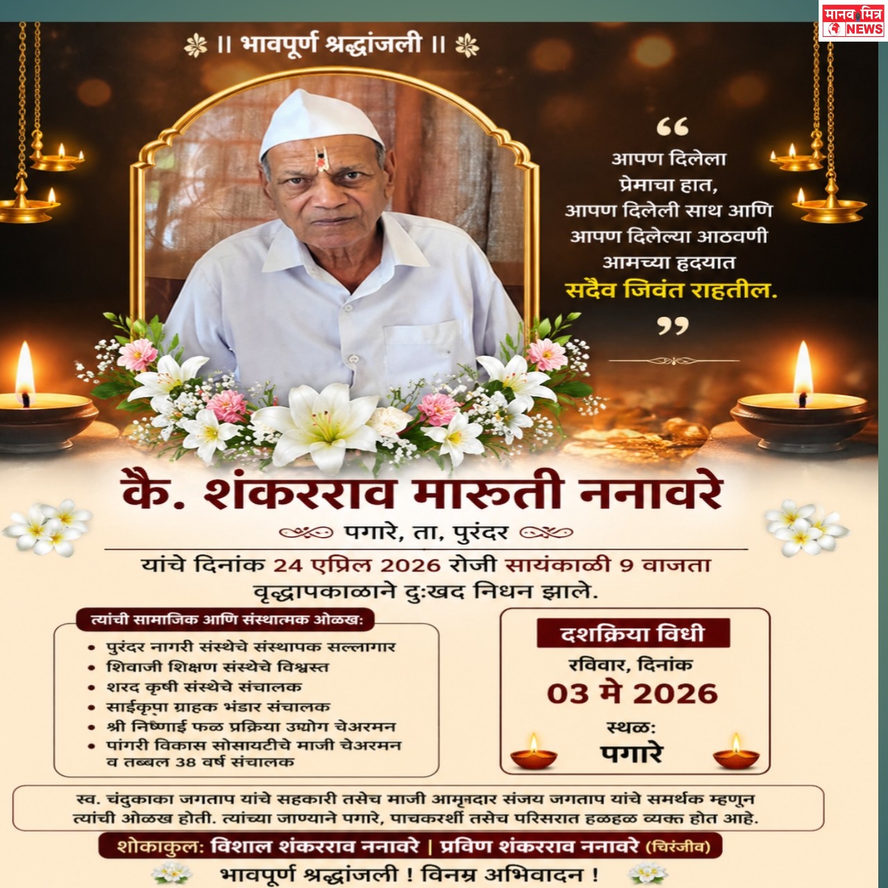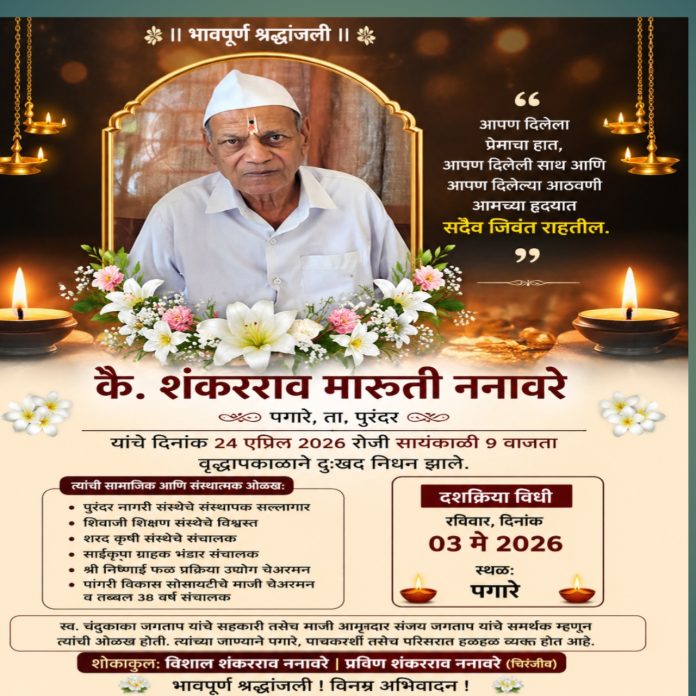 पुरंदर तालुक्यातील पगारे येथील ज्येष्ठ समाजसेवक के. शंकरराव मारुती ननावरे यांचे दिनांक 24 एप्रिल 2026 रोजी सायंकाळी 9 वाजता वृद्धापकाळाने दुःखद निधन झाले. त्यांच्या निधनाने पंगारे, पाचकरशी तसेच संपूर्ण परिसरात हळहळ व्यक्त होत आहे.