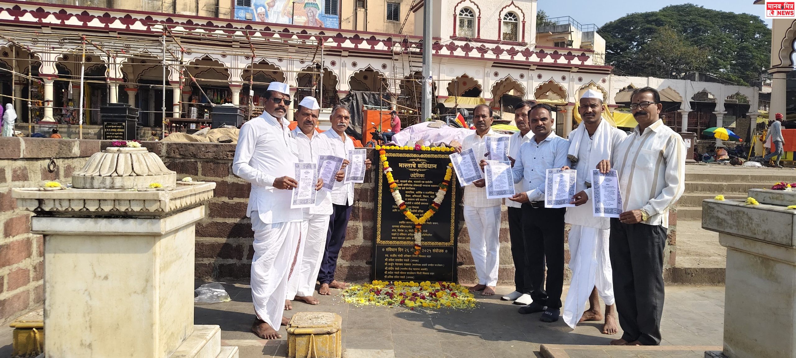 आळंदी (रवी कदम) : संविधान दिनानिमित्त आळंदी जनहित फाउंडेशन, भारतीय बौद्ध महासभा, स्व. राजीव गांधी प्रतिष्ठान पिंपरी चिंचवड, संदेश नवले सोशल फाउंडेशन तसेच आळंदी ग्रामस्थ यांच्या संयुक्त विद्यमाने संविधान उद्देशिकेचे कोनशिला पूजन, लोकार्पण व उद्देशिकेचे सामूहिक वाचन करण्यात आले. वारकरी, भाविक व नागरिकांना संविधान उद्देशिकेचे वाटप करून जनजागृती करण्यात आली.