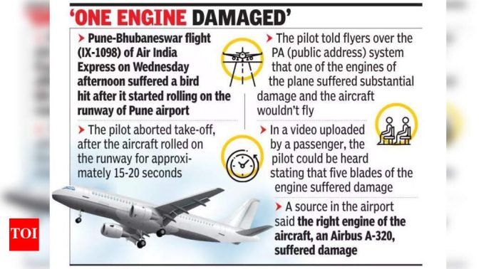 पुणे: बुधवारी दुपारी एअर इंडिया एक्सप्रेसच्या ‘पुणे-भुबनेश्वर फ्लाइट (आयएक्स -1098) च्या सुमारे १ Passengers० प्रवासींनी धावपट्टीवरुन फिरणे सुरू केल्यावर विमानाने टेक ऑफ केल्यामुळे जवळपास दाढी झाली.विमानाच्या 22 व्या क्रमांकावरील प्रवासी मोहम्मद नदीम यांनी टीओआयला सांगितले की, “वेग वाढल्यानंतर इंजिनमधून फ्लेम्स बाहेर येऊ लागल्या. त्यानंतरच पायलट ब्रेकवर आदळला आणि विमानाने जोरदार धडक दिली की काही प्रवाशांच्या सेलफोनने जवळजवळ एका महिलेच्या शस्त्रे पडल्या.”ते म्हणाले की, विमानाने जोरदार थांबण्यापूर्वी सुमारे 15-20 सेकंद धावपट्टीवर हे विमान धावपट्टीवर फिरले. पुणे विमानतळाची धावपट्टी लांबी 2,535 मीटर (8,316 फूट) आहे. एव्हिएशन तज्ञांनी टीओआयला सांगितले की टेक ऑफ करण्यापूर्वी एअरबस ए 320 सारख्या विमानाची सरासरी पीक वेग 250-300 किमी प्रति तास आहे.“विमानाचा वेग पायलटद्वारे नेहमीच ठरविला जातो. तीन प्रकारचे वेग आहे-व्ही 1 (निर्णय वेग), व्हीआर (रोटेशन स्पीड) आणि व्ही 2 (टेक-ऑफ सेफ्टी वेग). व्ही 1 ही आपत्कालीन परिस्थितीत एक आपत्कालीन परिस्थितीत पायलट सुरक्षितपणे घेता येईल. वी 1 च्या मर्यादेनंतर हवामानाचा वेग वाढला पाहिजे. फोर्स, “विमानचालन तज्ज्ञ धैर्यशिल वंडेकर म्हणाले.गेल्या महिन्यात, शहराच्या विमानतळावर उतरल्यानंतर एअर इंडियाच्या दिल्ली-पुणे विमानात एक पक्षी हिट सापडला. जूनमध्ये, भुवनेश्वर येथून एअर इंडियाच्या एक्स्प्रेसच्या विमानाने लँडिंगचा गर्भपात करावा लागला आणि पायलटने धावपट्टीवर कुत्राला शोधून काढले.बुधवारी दुपारी विमान थांबल्यानंतर सुमारे -10-१० मिनिटांनंतर एअर इंडियाच्या पुणे-भुबनेश्वर विमानात बुक केलेले नदीम यांनी सांगितले. “त्यानंतर पायलटने पीए (सार्वजनिक पत्ता) प्रणालीवरील घटनेबद्दल फ्लायर्सना सांगितले. ते म्हणाले की, एका इंजिनला मोठ्या प्रमाणात नुकसान झाले आहे आणि विमान उडणार नाही. काही काळानंतर विमान खाडीवर परत आले. आम्हाला खाली उतरून टर्मिनल इमारतीत नेण्यात आले,” तो म्हणाला.टीओआयने एअरलाइन्सच्या प्रवक्त्याशी फोनवर संपर्क साधला आणि घटनेबद्दल चौकशी करणारा व्हॉट्सअ‍ॅप संदेश त्याला पाठविला. पण दाबायला जाईपर्यंत उत्तराची प्रतीक्षा होती.विमानतळावरील एका स्त्रोताने सांगितले की, एअरबस ए -320, विमानाच्या योग्य इंजिनला नुकसान झाले आहे. नदीमने अपलोड केलेल्या व्हिडिओमध्ये, पायलटला असे ऐकले जाऊ शकते की इंजिनच्या पाच ब्लेडचे नुकसान झाले आहे. पायलटने असेही म्हटले आहे की धावपट्टीवर एक मोठा पक्षी शोधला गेला आणि तो विमानाच्या इंजिनवर आदळला.नदीम म्हणाले, “एअरलाइन्सने सांगितले की, फ्लायर्ससाठी पर्यायी विमानांची व्यवस्था केली जात आहे. मला दिल्लीला जोडणारी उ