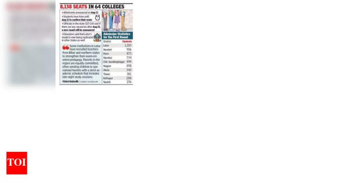 पुणे: 13 ऑगस्ट रोजी जाहीर केलेल्या एमबीबीएस अभ्यासक्रमांच्या प्रवेशाच्या पहिल्या यादीमध्ये महाराष्ट्रात ‘लॅटूर पॅटर्न’ वर्चस्व गाजवले. या नमुन्यात परीक्षेच्या काही महिन्यांपूर्वी मॉडेल प्रश्नपत्रिकांचा सतत आणि पद्धतशीर सराव असतो आणि दशकांपासून एसएससी किंवा एचएससी परीक्षांशी संबंधित आहे.Gov 64 सरकार आणि खासगी वैद्यकीय महाविद्यालयांमध्ये पहिल्या फेरीत जागा मिळविणा 8 ्या ,, १88 विद्यार्थ्यांपैकी, लातूर जिल्ह्यातील सर्वोच्च -१,२०3 विद्यार्थी. 936 विद्यार्थ्यांसह नांडेड दुसर्‍या क्रमांकावर आला. दोन्ही मराठवाडा जिल्ह्यांमध्ये त्यांच्या दरम्यानच्या एकूण जागांपैकी 24% जागा आहेत. पुणे, 873 जागा आणि मुंबई, 734 सह, पहिल्या दोन जिल्ह्यांचा पाठलाग करतात.प्रवेश परीक्षेच्या तयारीवर या प्रदेशाच्या अनोख्या फोकसला लॅटूरच्या वर्चस्वाचे श्रेय तज्ञ आणि शिक्षकांनी दिले आहेत. लॅटूर आणि नांडेडमधील शाळा आणि कनिष्ठ महाविद्यालये एसटीडी आठवीच्या सुरुवातीपासूनच एनईईटी आणि जेईईची संरचित तयारी सुरू करतात. लॅटूर-आधारित वैद्यकीय सल्लागार सचिन बांगाद यांनी गुरुवारी टीओआयला सांगितले की, “येथे सर्व महाविद्यालयांमध्ये वैद्यकीय किंवा अभियांत्रिकी जागांसाठी विद्यार्थ्यांच्या तयारीवर लक्ष केंद्रित केले आहे. गेल्या काही वर्षांत लॅटूर पॅटर्नच्या यशामुळे संपूर्ण महाराष्ट्रातील विद्यार्थ्यांनाही आकर्षित केले आहे. या प्रवेश परीक्षेच्या तयारीसाठी ते लॅटूर येथे येतात आणि जवळपास आहेत.”इथली महाविद्यालये एमबीबीएस प्रवेशात सातत्याने उच्च संख्या पोस्ट करीत आहेत. यावर्षी लॅटूरमधील राजशी शाहू महाविद्यालयातील 37 विद्यार्थ्यांनी ते एम्स आणि इतर सर्वोच्च वैद्यकीय संस्थांमध्ये प्रवेश केला. मुख्य महादेव गावणे म्हणाले, “दीर्घ अभ्यासाचे तास, कठोर चाचण्या आणि मार्गदर्शनाचा पाठिंबा असलेल्या पद्धतशीर दृष्टिकोनाने अनेकांना ‘टॉपर्सचा कारखाना’ असे म्हटले आहे. ही प्रणाली कित्येक वर्षांपासून आहे आणि परिणाम स्पष्ट आहेत.प्रमुख: 64 महाविद्यालयांमध्ये 8,138 जागा13 ऑगस्ट रोजी वाटप केले विद्यार्थ्यांकडे 22 ऑगस्टपर्यंत त्यांच्या जागांची पुष्टी करण्यासाठी वेळ आहेराज्य सीईटी सेलमधील अधिका said ्यांनी सांगितले की जर ऑगस्ट 22 नंतर काही रिक्त जागा असतील तर नवीन फेरी जाहीर केली जाईलशिक्षक म्हणाले की लॅटूरचे मॉडेल आता इतर राज्यांमध्येही पुन्हा तयार केले जात आहेपहिल्या फेरीसाठी प्रवेश आकडेवारी जिल्हा विद्यार्थी लॅटूर: 1,203 नांडेड: 936 पुणे: 873 मुंबई: 734 Chh. संभाजीनगर: 499नागपूर: 498अकोला: 340 ठाणे: 301 कोल्हापूर: 288नाशिक: 276 लातूरमधील काही संस्थांनी त्यांची परीक्षा-देणारं अध्यापन बळकट करण्यासाठी बिहार आणि उत्तर राज
