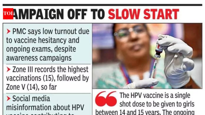 पुणे: केंद्र सरकारच्या मोफत HPV राष्ट्रीय लसीकरण मोहिमेअंतर्गत गेल्या पाच दिवसांत नागरी संस्था केवळ 44 मुलींना लसीकरण करण्यात यशस्वी ठरली, लसींचा संकोच आणि सध्या सुरू असलेल्या परीक्षेचा हंगाम हे कमी मतदानाचे कारण आहे — अनेक जागरूकता कार्यक्रम असूनही.पीएमसी झोन ​​I मध्ये येरवडा-कळस-धानोरीआँडनगर रोड-वडगाव शेरीयेरियाचा समावेश आहे आणि पाच मुलींना लसीकरण केल्याचे दिसले. शिवाजीनगर-शोळे रोड, औंध-बाणेर आणि कोथरूड-बावधन या झोन २ मध्ये तीन मुलींना लसीकरण करण्यात आले. धनकवडी-सहकारनगर, वारजे-कर्वेनगर आणि सिंहगड रोड प्रभाग कार्यालयाचा समावेश असलेल्या झोन III मध्ये सर्वाधिक 15 मुलींना लस टोचण्यात आले. झोन 4 मध्ये हडपसर-मुंढवा, वानोवरी-रामटेकडी आणि कोंढवा-येवलेवाडी, झोन पाचमध्ये भवानी पेठ, बिबवेवाडी आणि कसबा-विश्रामबाग वाडा या भागात सात मुलींनी 14 मुलींना लसीकरण केले.कोथरूड-बावधन प्रभाग कार्यालयातील वैद्यकीय अधिकारी डॉ. अंजली टिळेकर म्हणाल्या, “सोशल मीडिया ॲप्सवर फिरणाऱ्या मेसेजेसमध्ये या लसीबाबत चुकीची माहिती पसरवली गेली आहे, जी नवीन नाही आणि गेल्या 15 वर्षांपासून बाजारात आहे. ती खाजगी रुग्णालये वापरत आहेत. शिवाय, खोट्या माहितीमुळे पालक भयभीत झाले आहेत, तर अनेक मुले परीक्षेची वाट पाहत शाळेत पोहोचत आहेत. मुलींना तेच समजावून सांगणे, ज्यांची संमती आवश्यक आहे त्यांच्याशी बोलण्यासाठी आम्ही पालक-शिक्षक बैठकीची वाट पाहत आहोत.दरम्यान, आरोग्य कर्मचाऱ्यांना घटनास्थळी मुलींची नोंदणी करण्याचे प्रशिक्षण दिले जाते. दिघे म्हणाले, “ही ९० दिवसांची मोहीम आहे आणि परीक्षा संपल्यानंतर आम्हाला सकारात्मक मतदानाची आशा आहे.”