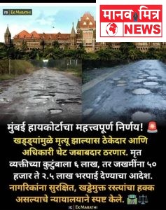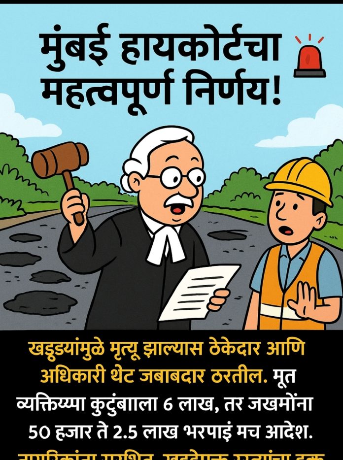 मुंबई उच्च न्यायालयाने (हायकोर्टाने) खड्ड्यांमुळे होणाऱ्या मृत्यू आणि अपघातांबाबत अत्यंत महत्त्वपूर्ण निर्णय दिला आहेत