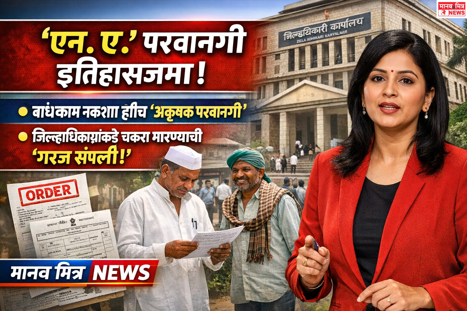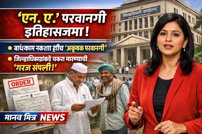 मुंबई, दि. ११ : राज्यातील नागरिकांसाठी मोठा दिलासा देणारा निर्णय घेत महाराष्ट्र सरकारने कृषी जमीन अकृषक (एन.ए.) करण्यासाठी लागणारी स्वतंत्र परवानगी प्रक्रिया रद्द केली आहे. आता नगर रचना विभाग किंवा स्थानिक नियोजन प्राधिकरणाने दिलेली बांधकाम नकाशा मंजुरी हीच अकृषक परवानगी म्हणून ग्राह्य धरली जाणार आहे. त्यामुळे जिल्हाधिकाऱ्यांकडून स्वतंत्र परवानगी घेण्याची आवश्यकता राहणार नाही.